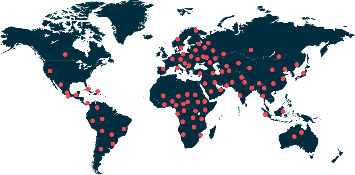 *The pink dots represent our reach, where we either have a team on the ground or our programs are broadcasted there.